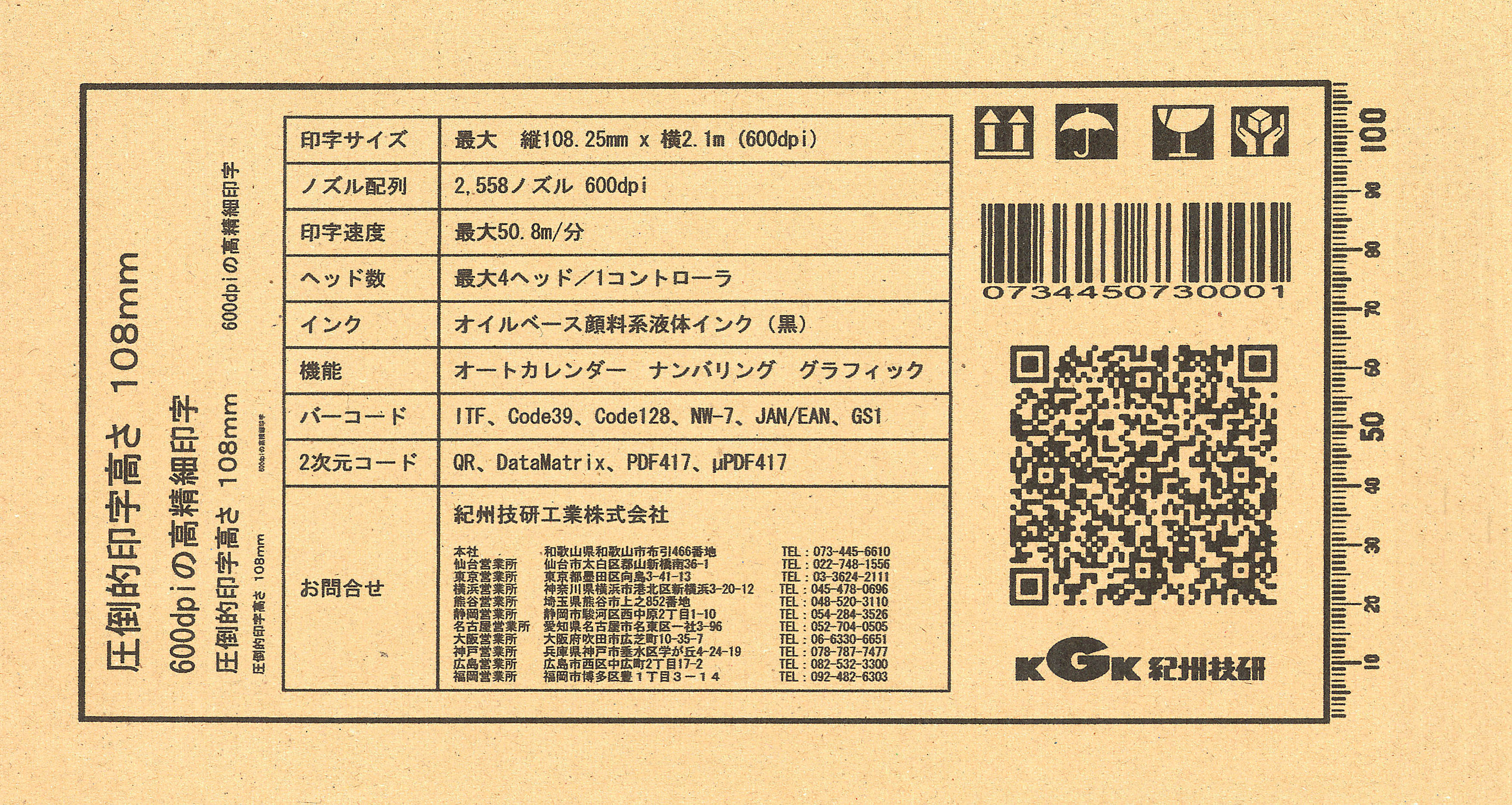 • 实现印字高度最高 108 mm。600dpi高解析度。UV 固化墨水对应。